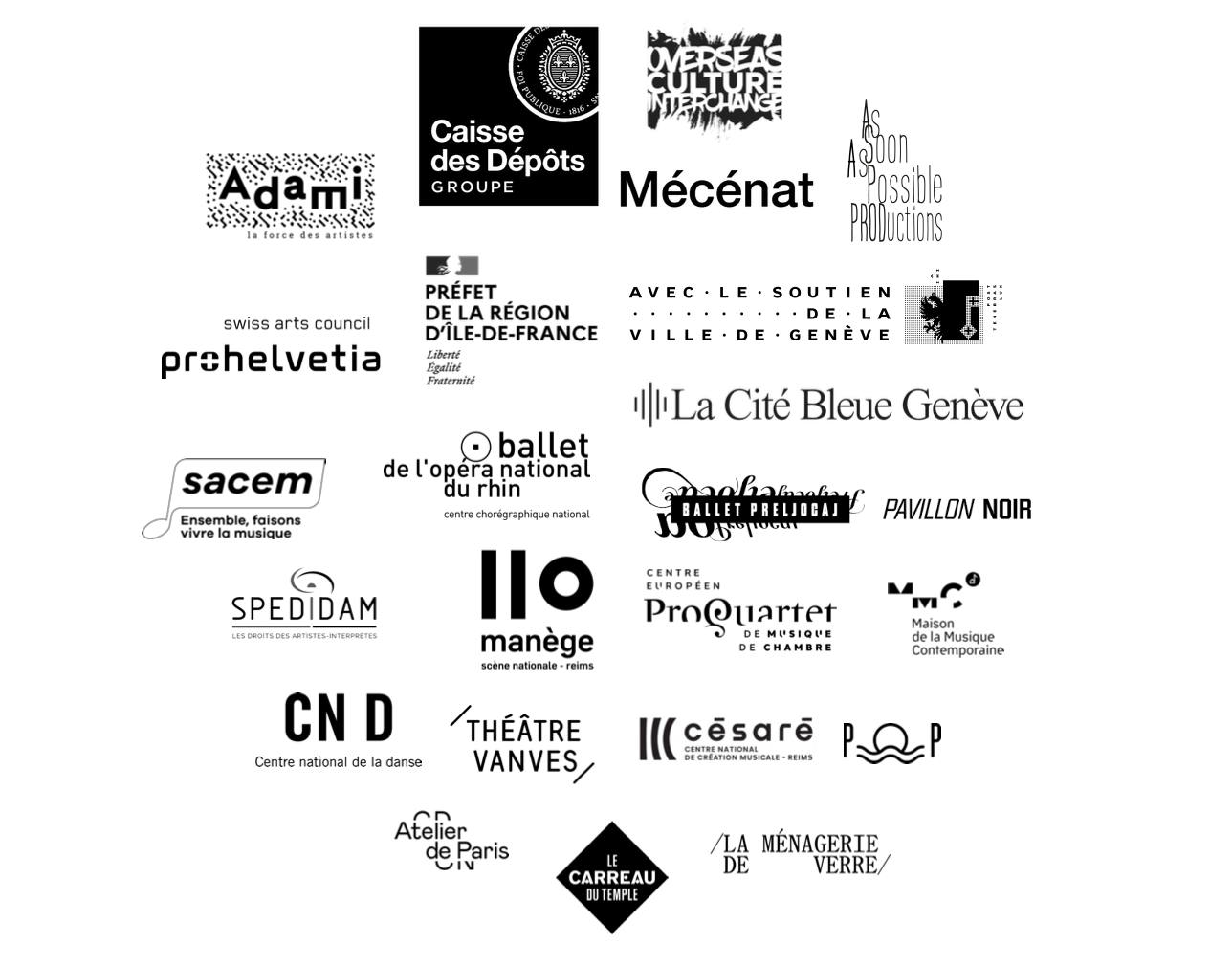 Supported by patronage of the City of Geneva, the Swiss arts council Pro Helvetia, the Caisse des Dépôts, ministry of Culture – Direction régionale des affaires culturelles d’Île-de-France, Adami, Sacem, Spedidam, MMC - Maison de la Musique Contemporaine, Théâtre de Vanves, Césaré (Centre National de Création Musicale - Reims), CND - Centre National de la Danse, Pantin accueil en résidence longue, du Carreau du Temple, de La Ménagerie de Verre, La Pop, Studio ADC